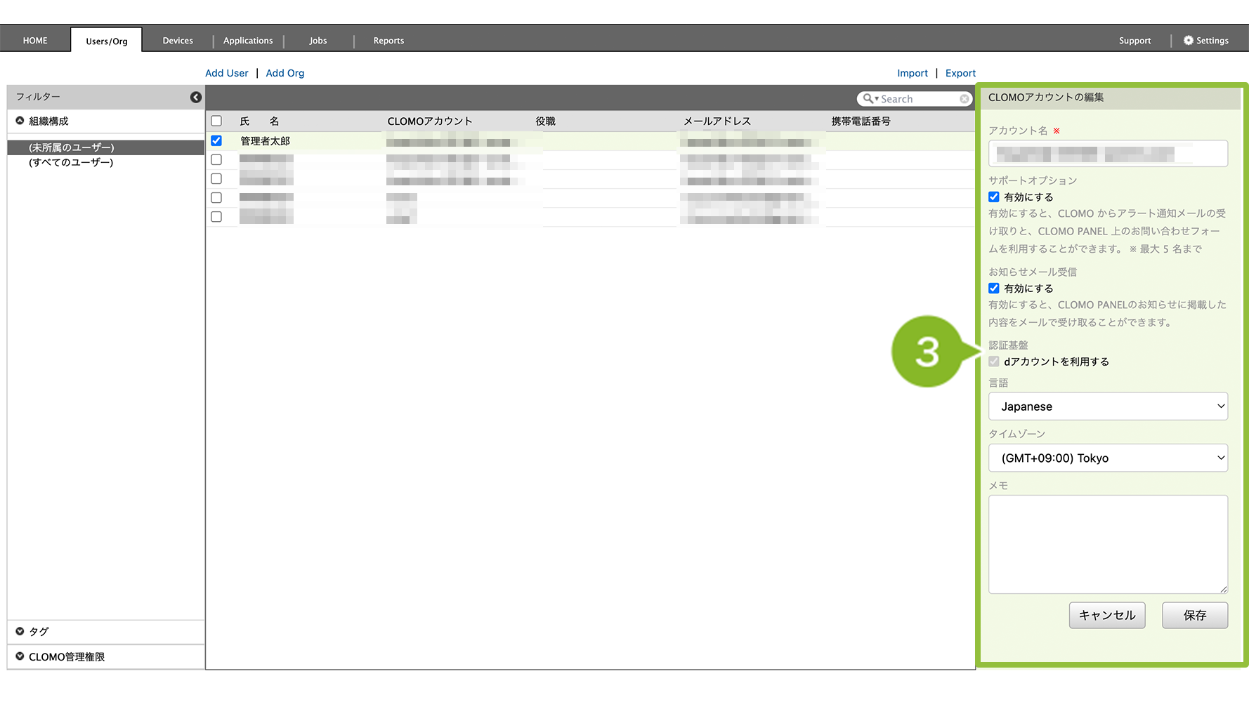 CLOMO PANEL の「Users /Org」画面で情報を変更できます。