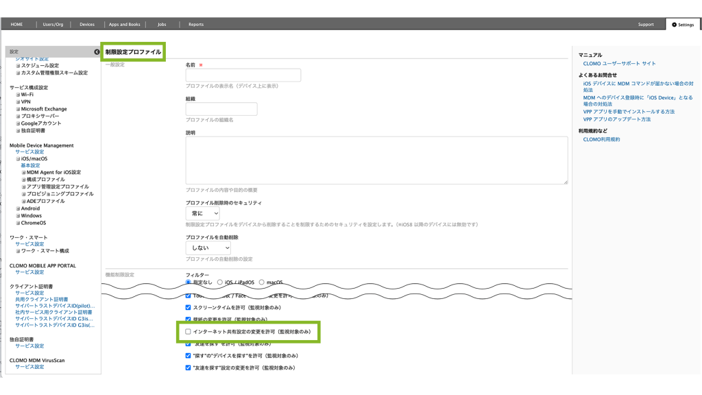 「インターネット共有設定の変更を許可(監視対象のみ)」を制限した制限設定プロファイルを作成します。対応方法は2パターンあります。