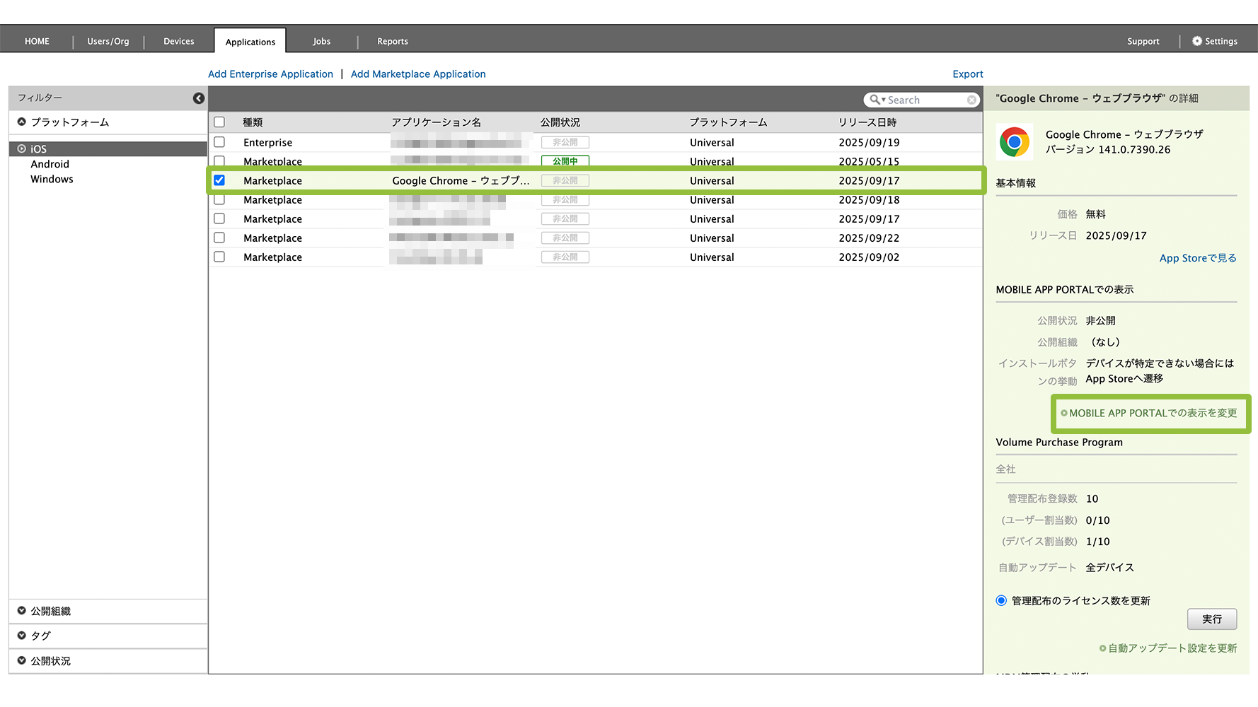 1. Applications 画面からアプリケーションを選択後、「MOBILE APP PORTAL」を選択します。