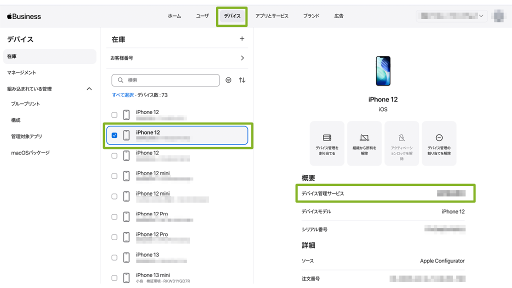 1. 管理者の役割を持つユーザで Apple Business にサインインし、デバイスをクリックします。