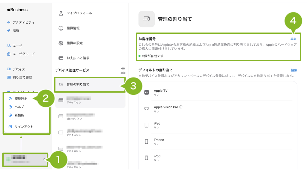 4. 「お客様番号」の項目にある[編集]をクリックし、Apple お客様番号 または 販売代理店番号 を入力します。入力後、[追加]>[完了]をクリックしてください。