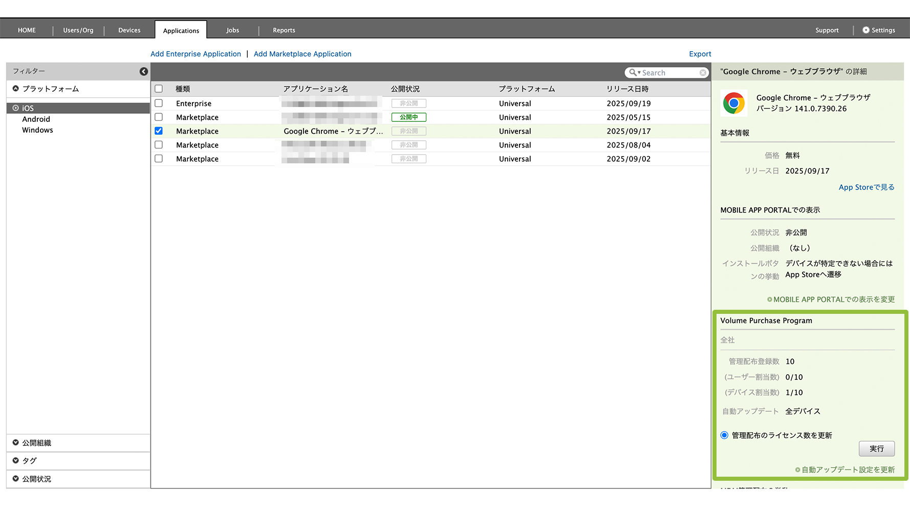 Apple Business Manager(ABM)で購入した VPP ライセンスの情報は、アップロード済みの VPP トークンをもとに Apple 社より情報連携され、その結果のライセンス数を Applications 画面に表示しています。