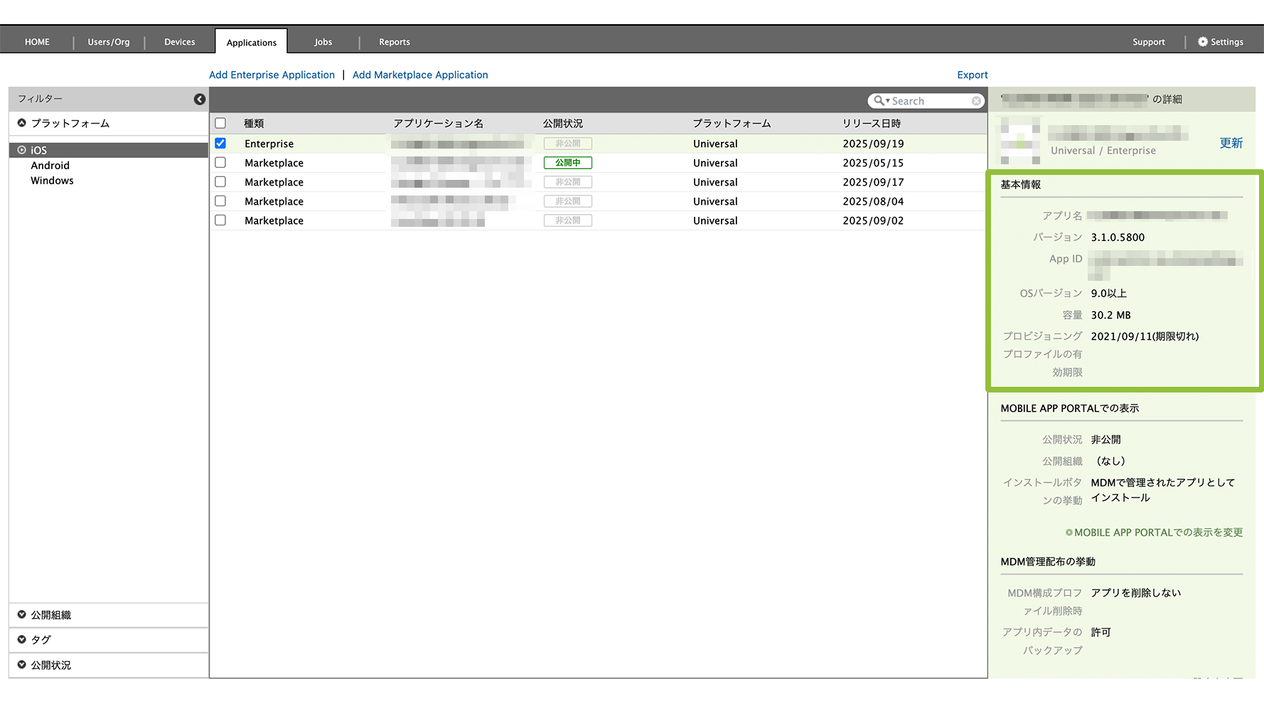 また、Enterprise アプリの場合は、個別のアプリの容量を Applications 画面から確認できます。
