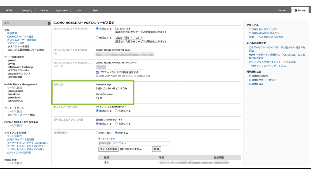 CLOMO PANEL の「Settings」から CLOMO MOBILE APP PORTALの「サービス設定」を選択し、「利用状況」の項目からアプリの合計容量を確認します。