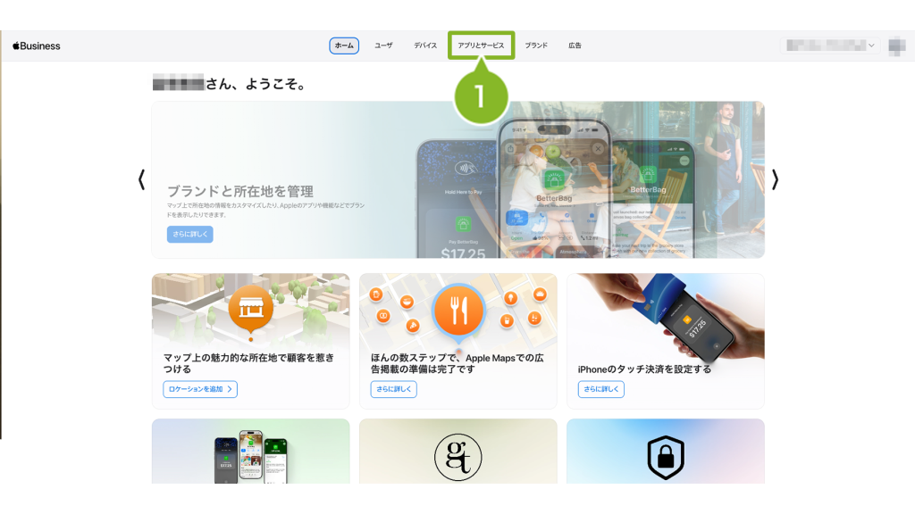 Apple Business (https://business.apple.com/)にログイン後、[アプリとサービス]をクリックします。
