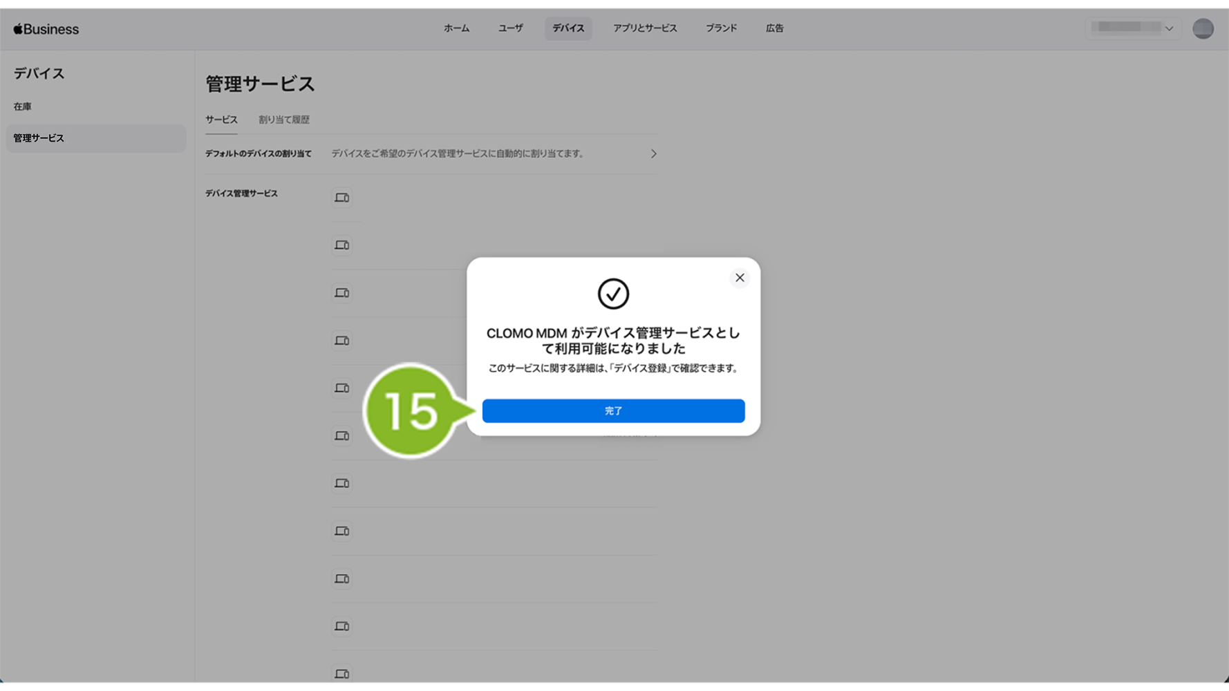 割り当て後、「デバイス管理サービス」を確認します。割り当てたサービス名が表示されていたら、完了です。