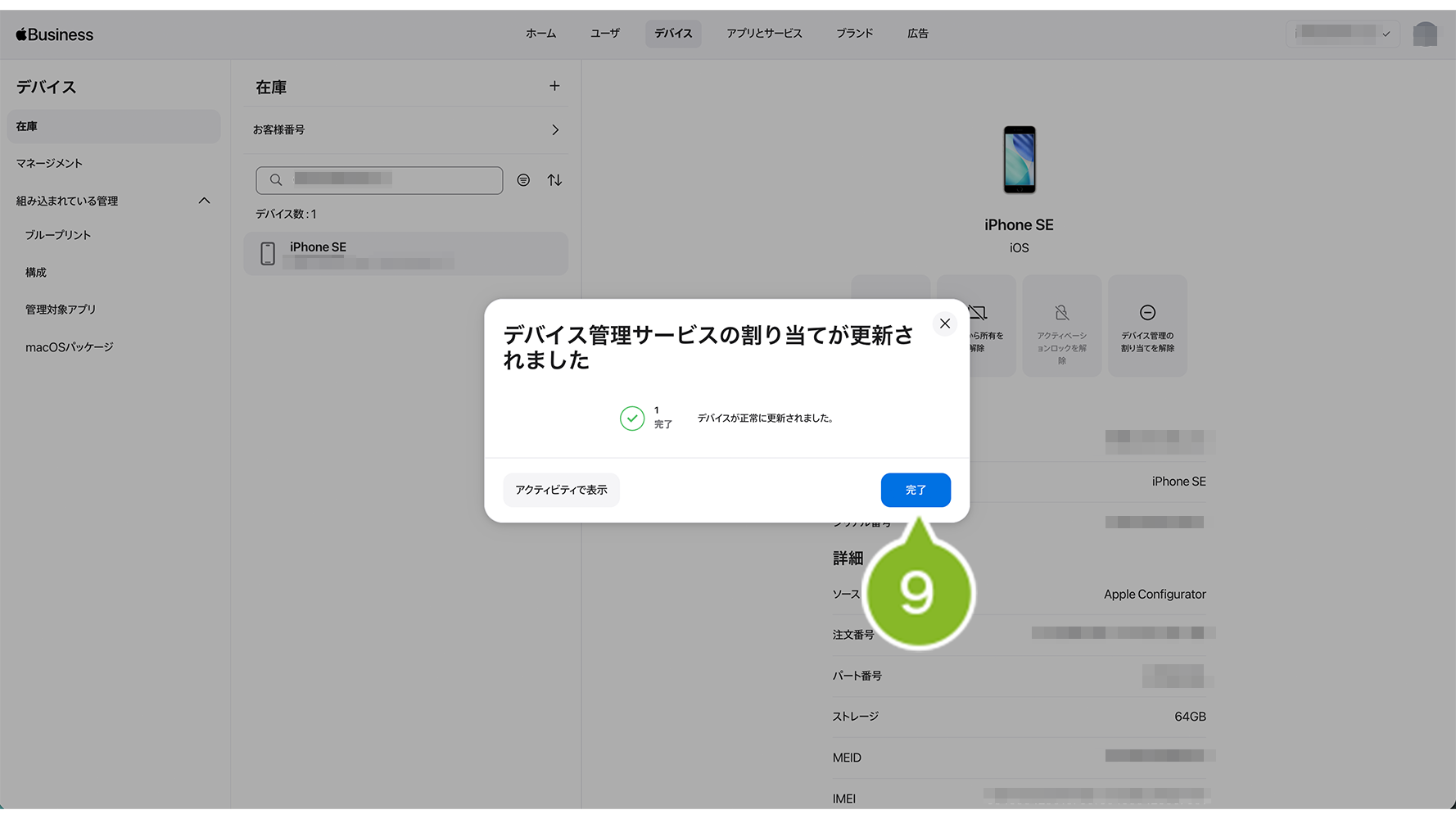 ※「iPhone を組織 / 団体から削除」を選ぶと、Apple Business 上でデバイスの所有が解除されます。再度 ADE 化が必要になるため、選択しないでください。