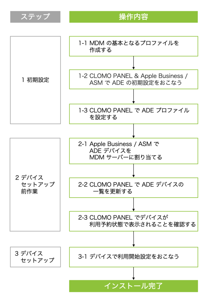 初期設定では、MDM 構成プロファイルの作成、ADE の初期設定、ADE プロファイルの作成が必要となります。