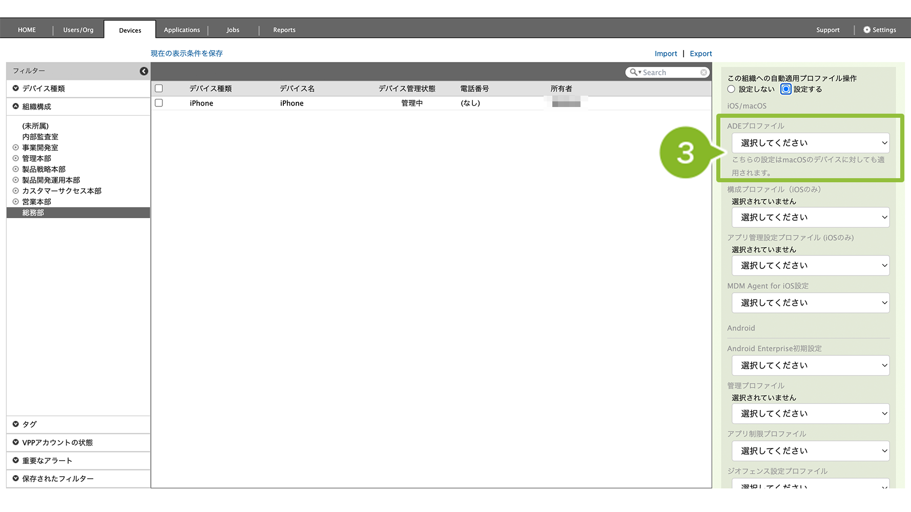 ※「iPhone を組織 / 団体から削除」を選ぶと、ABM 上でデバイスの所有が解除されます。再度 ADE 化が必要になるため、選択しないでください。