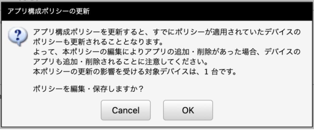 既存のアプリ構成ポリシーを編集し保存をすると、以下のメッセージが表示されます。