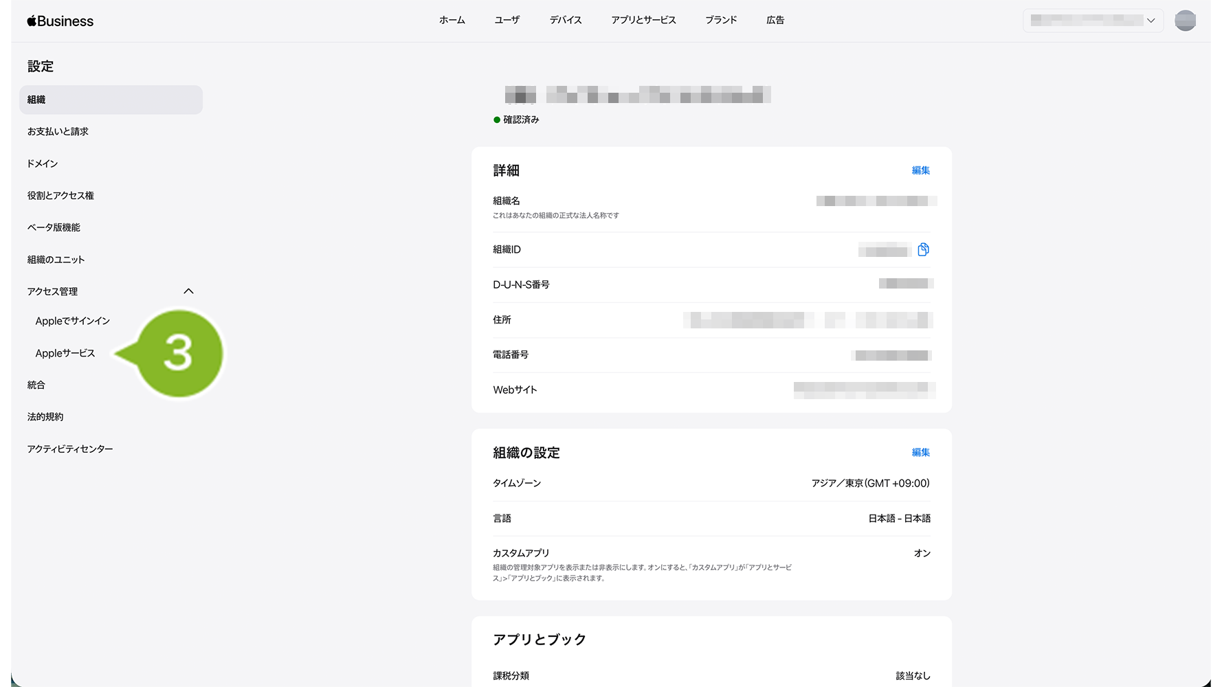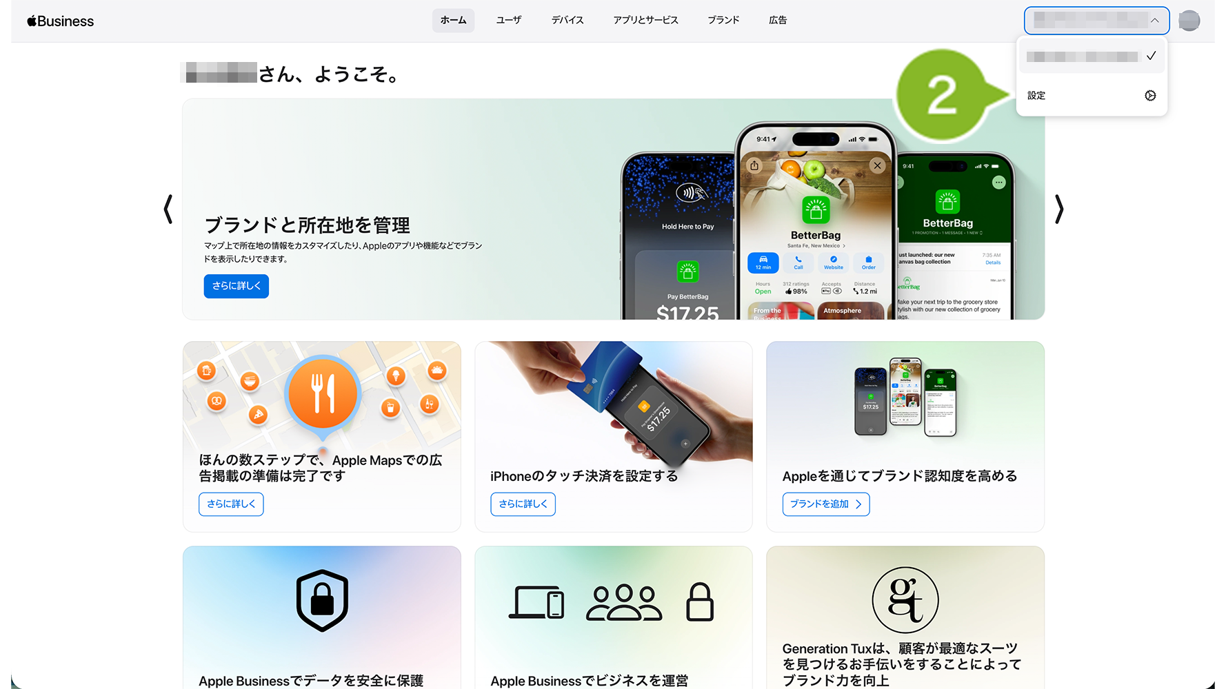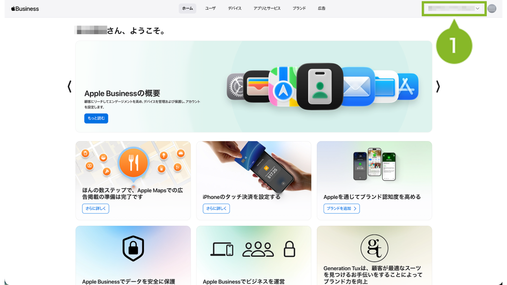 1. Apple Business にサインインして、右上の組織名をクリックします。