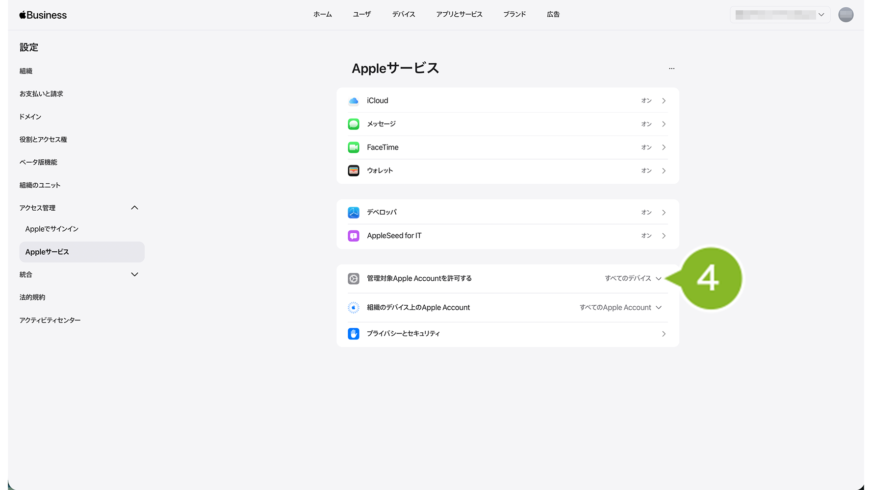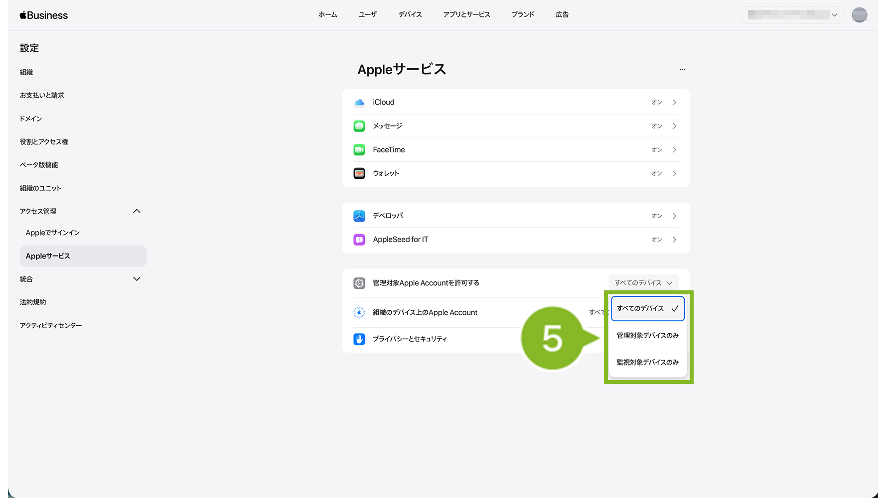 4.「管理対象 Apple Account を許可する」の[すべてのデバイス]をクリックします。