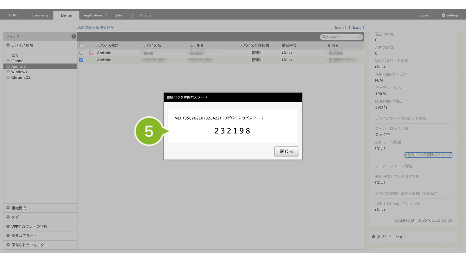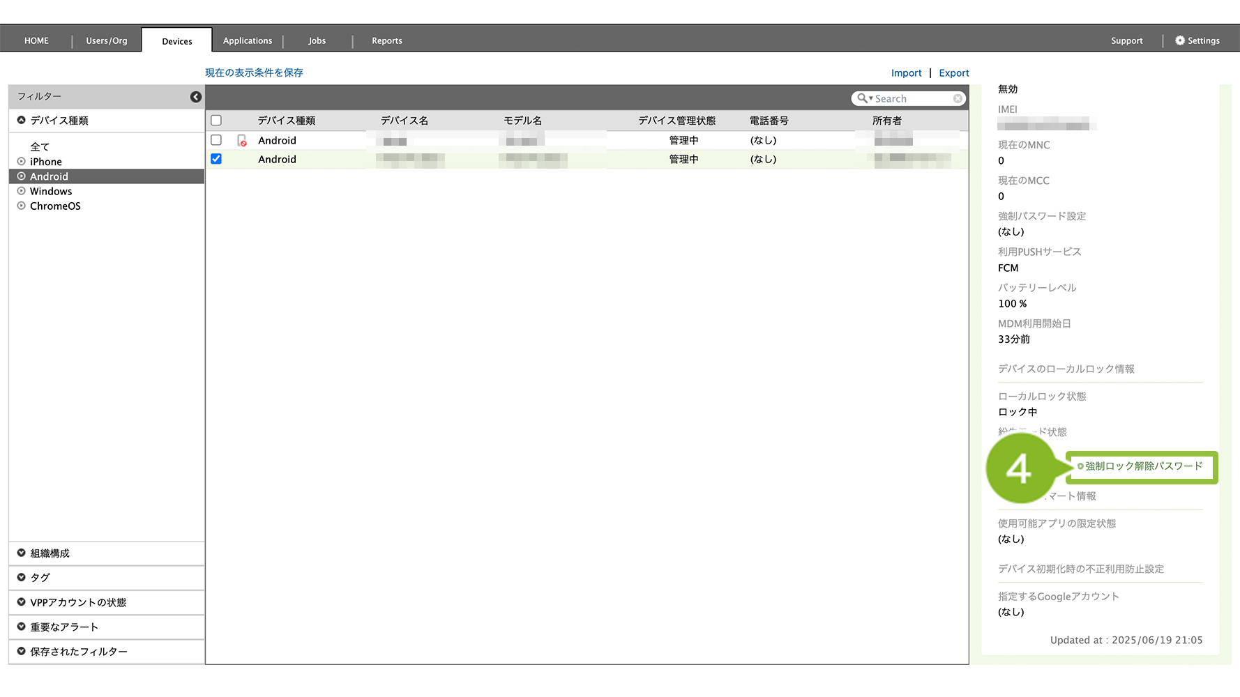 ※ デバイス詳細情報のローカルロック状態が「なし」の状態でも強制解除を実施することができます。