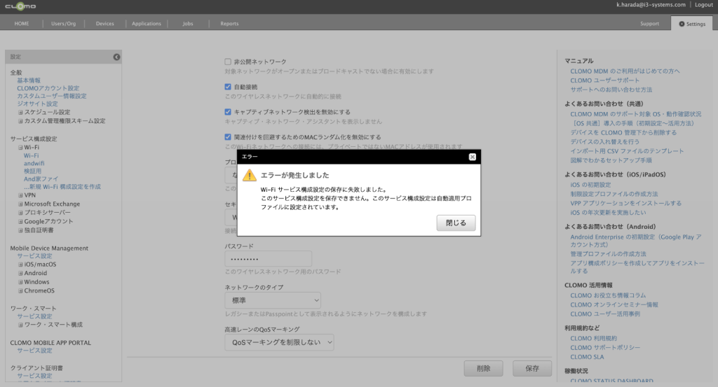 Wi-Fi 設定に限らず、VPN など他のサービス構成設定でも同じくエラーが表示されます。