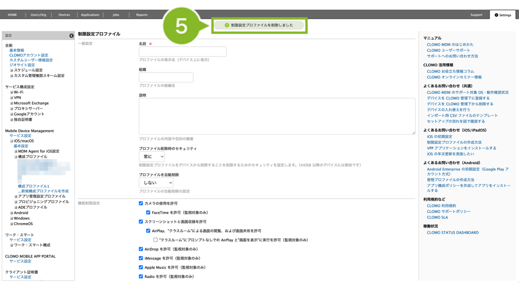 1. 「各種プロファイルのインストールと削除」をご参照の上、制限を一時的に解除したいデバイスに以下の操作を実施してください。