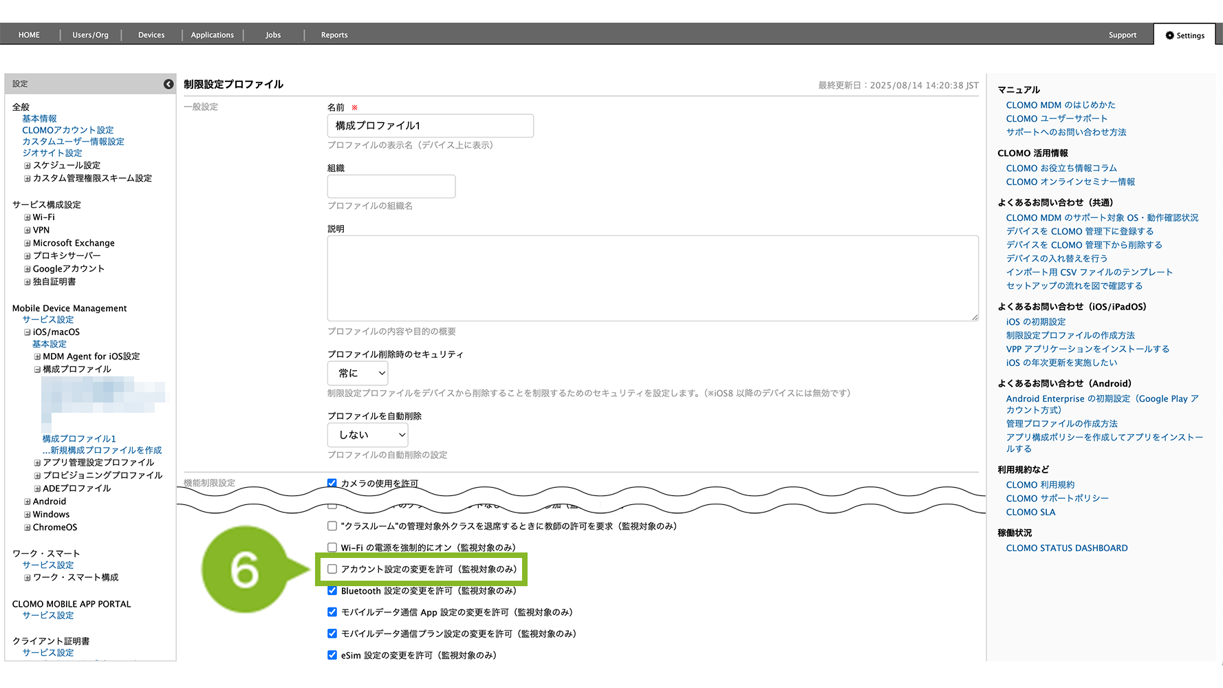 1. 制限を一時的に解除したいデバイスから、1-1の手順5で選択した、複製前のプロファイルをアンインストールします。