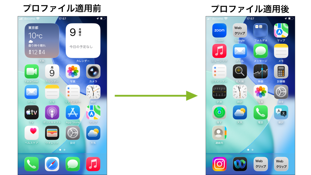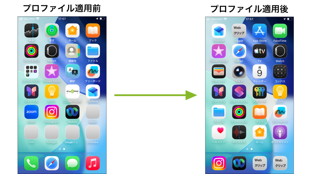 ホーム画面レイアウト設定プロファイル適用後は、デバイス側からアイコンの配置変更をすることができません。