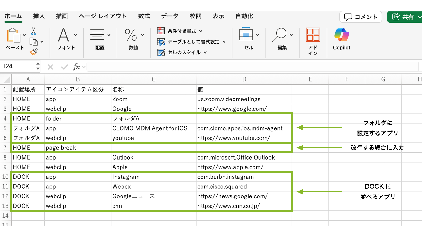 上記例のホーム画面 1 ページ目、2 ページ目および Dock のレイアウトを変更する CSV は以下となります。