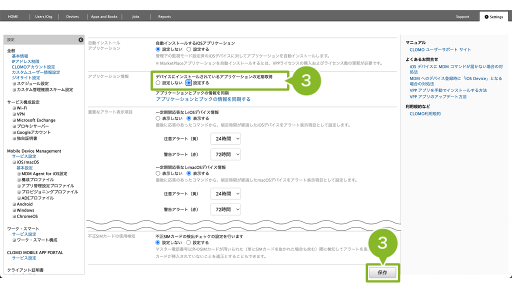 3. アプリケーション情報の「デバイスにインストールされているアプリケーションの定期取得」を「設定する」を選択し、[保存]をクリックします。