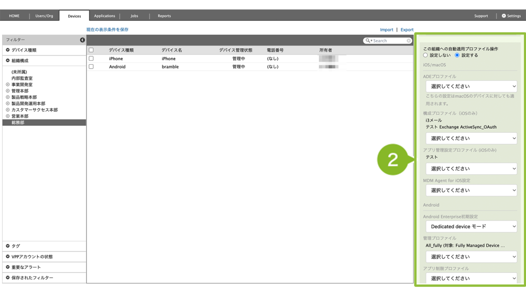 1. CLOMO PANEL の「Devices」画面から「組織構成」の「(任意の)組織」を選択します。