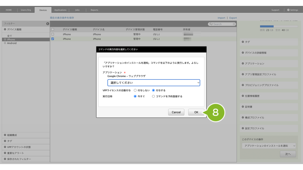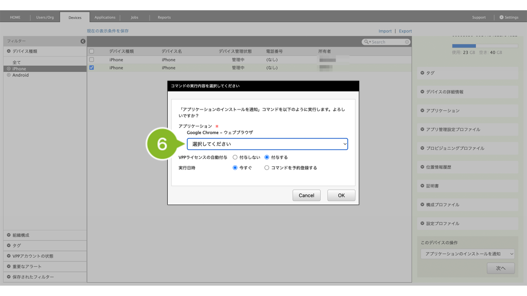VPP ライセンスが付与されていない場合、「VPP アプリケーションライセンスを付与する」で VPP ライセンスを付与後、アプリケーションのインストール実行をおこなってください。