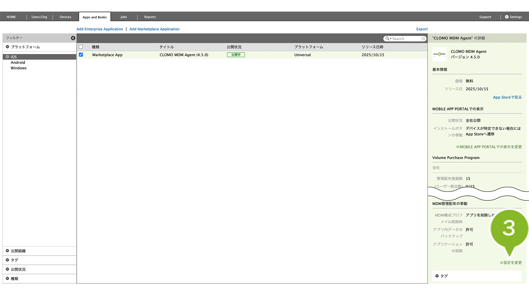 CLOMO MOBILE APP PORTAL(MAP)上の表示やインストールの挙動を設定できます。