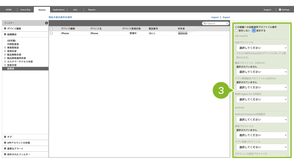 MDM 管理下にあるデバイスに対して、一律で適用させたいプロファイルがある場合、自動適用プロファイルとして設定をおこなうことができます。
