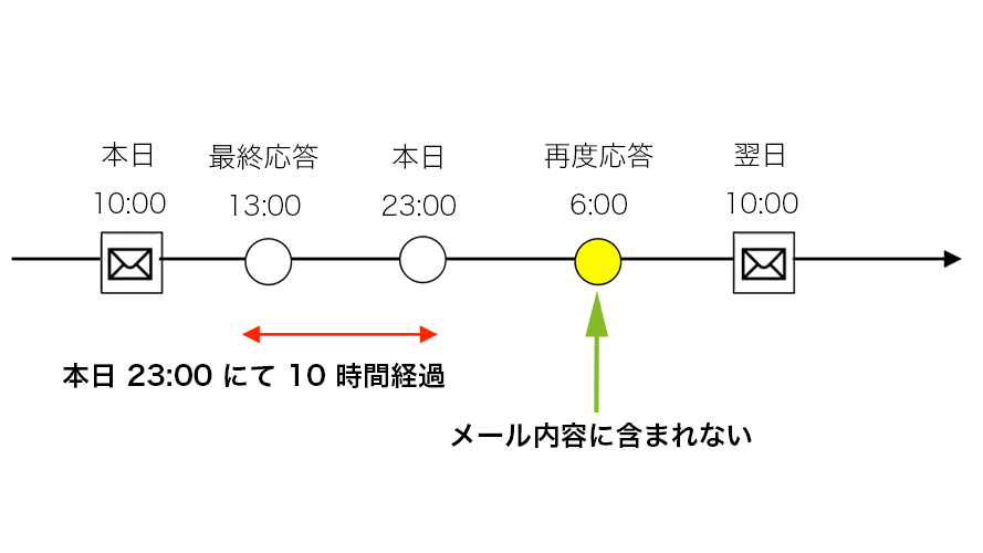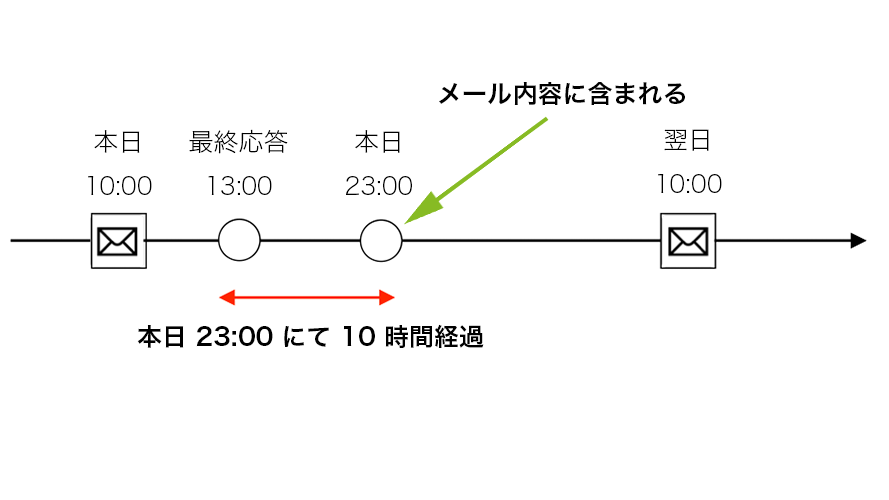 例2:アラート時間を10時間に設定し、最終応答が13時の場合