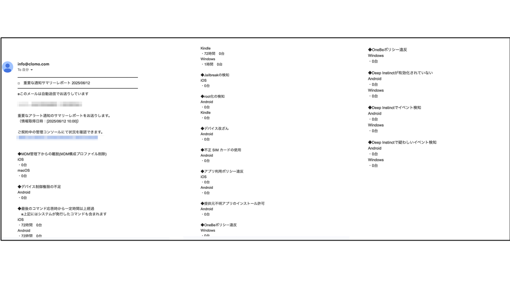毎日1度、AM10:00 頃(日本時間)に日次サマリーとしてデバイスの状態がメールにて送信されます。