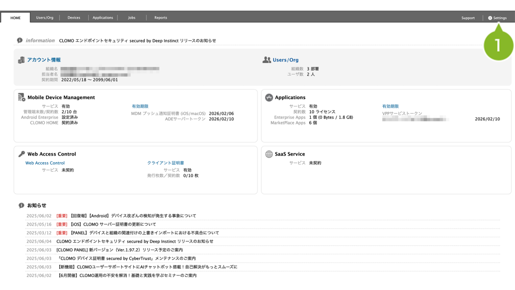 1. CLOMO PANEL にログイン後、[Settings]をクリックします。