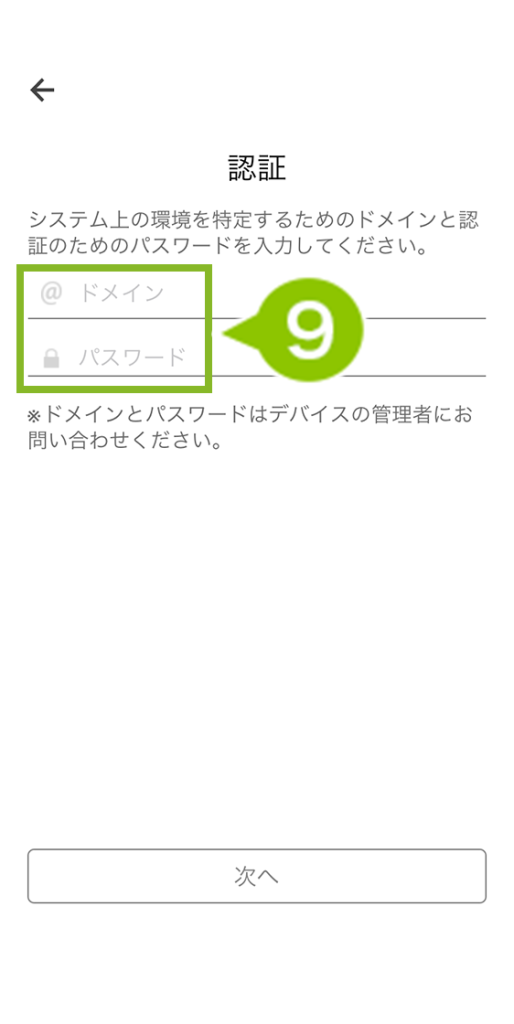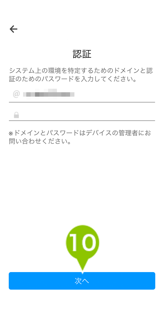 9. ドメインとパスワードを入力します。確認方法はMDM Agent for iOS の初期設定をご参照ください。