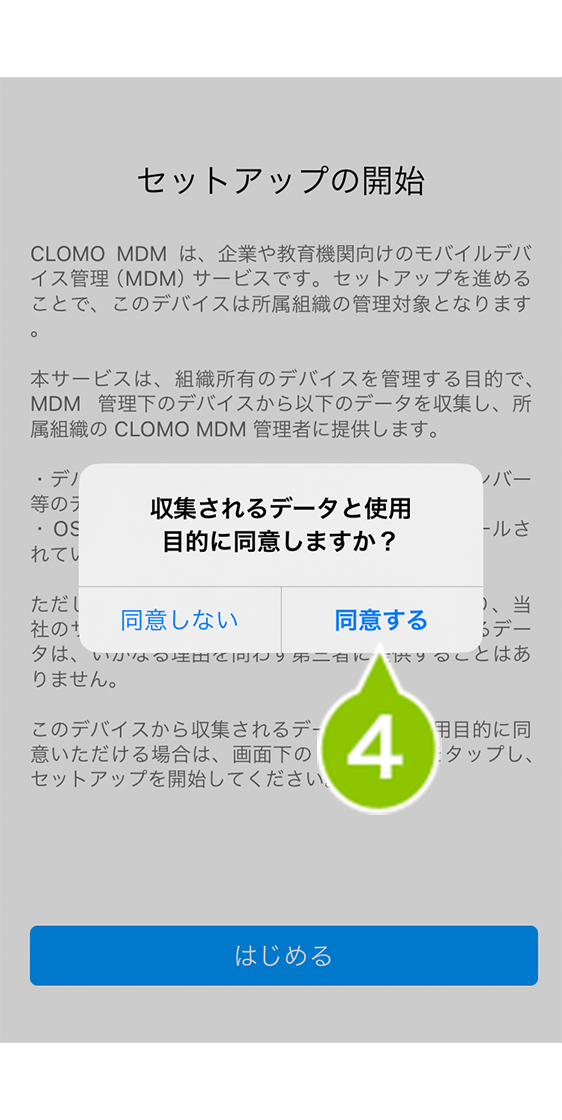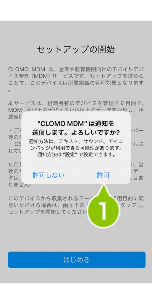 1. インストールした CLOMO MDM Agent for iOS を起動し、「許可」を選択します。