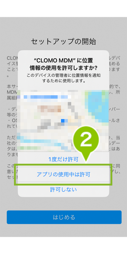 ※ 位置情報の許可は任意ですが、CLOMO MDM でデバイスの位置情報を取得する予定がある場合は「アプリの使用中は許可」を選択してください。