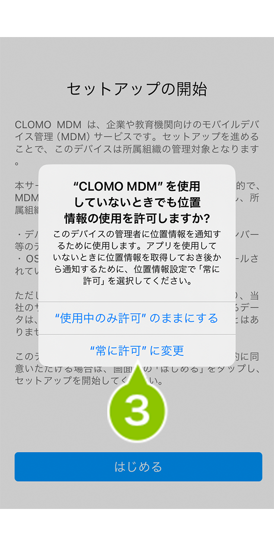 ※ 位置情報の許可は任意ですが、CLOMO MDM でデバイスの位置情報を取得する予定がある場合は「"常に許可" に変更」を選択してください。