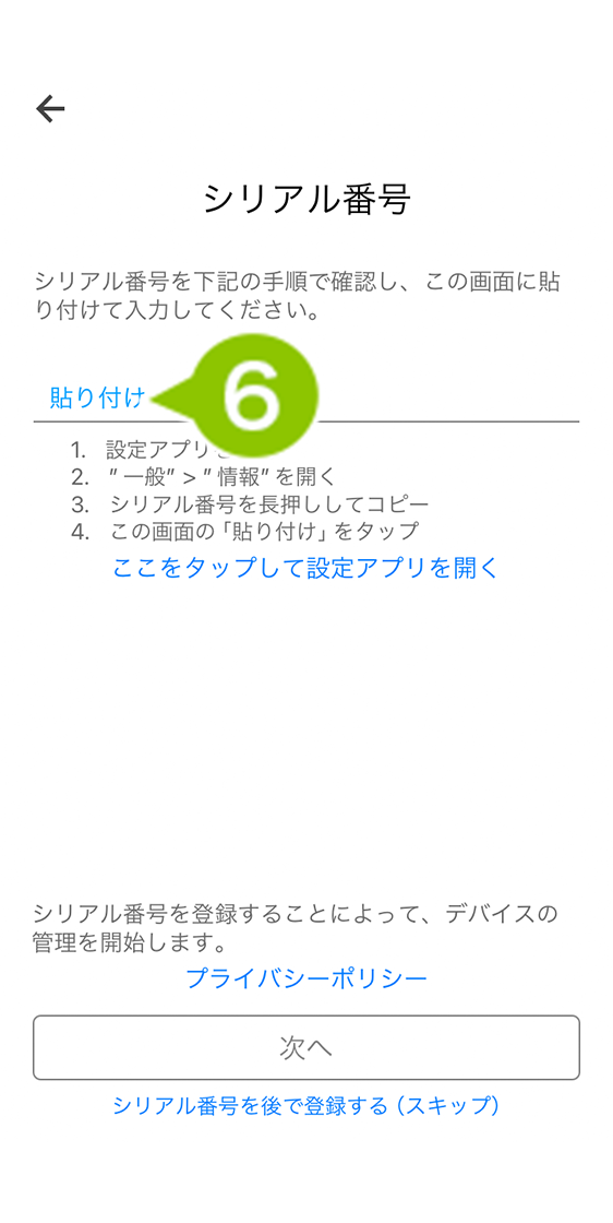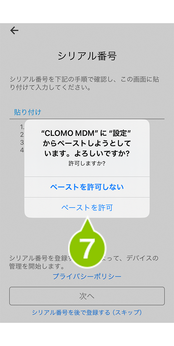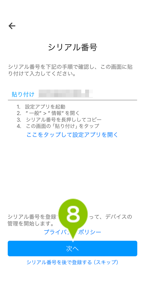 シリアル番号の入力をスキップした場合、CLOMO MDM Agent for iOS のコマンド、位置情報の取得、Jailbreak の検知がおこなえませんので、必ず入力してください。スキップしても、後ほど情報画面から入力することができます。