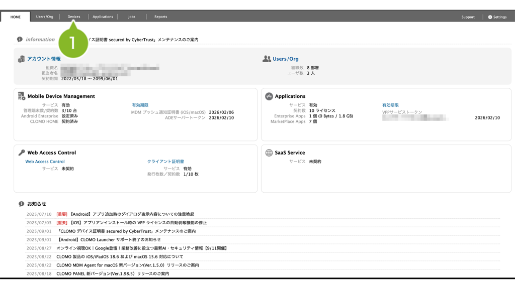 1. CLOMO PANEL にログイン後、[Devices]をクリックします。