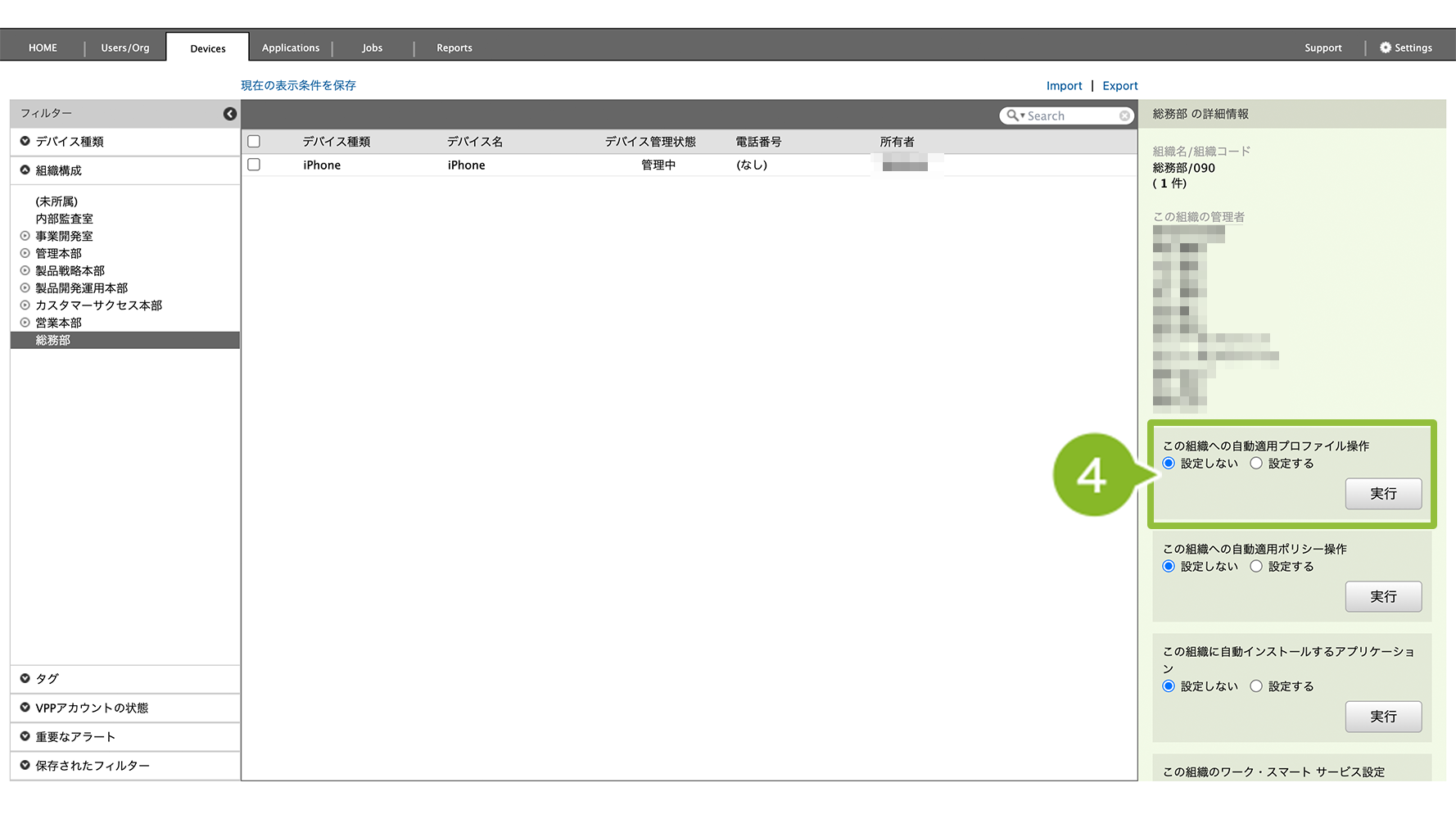 Devices 画面から利用予約されているデバイスが登録された場合に、組織ごとに自動でプロファイルを適用することができます。また、自動適用プロファイルが設定された組織にデバイスが関連付けされた場合も同様に適用されます。
