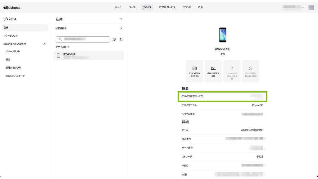 割り当て後、「デバイス管理サービス」を確認します。割り当てたサービス名が表示されていたら、完了です。