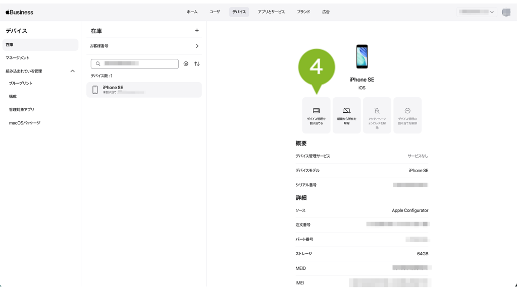 購入した ADE デバイス情報は Apple お客様番号や販売店 ID を通じて Apple Business に自動で登録されています。
