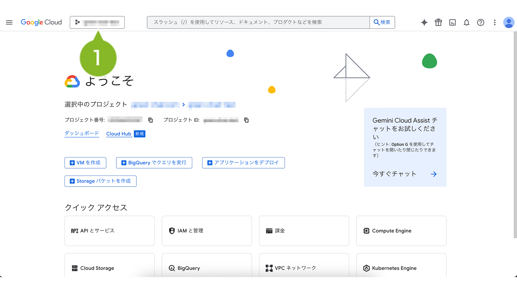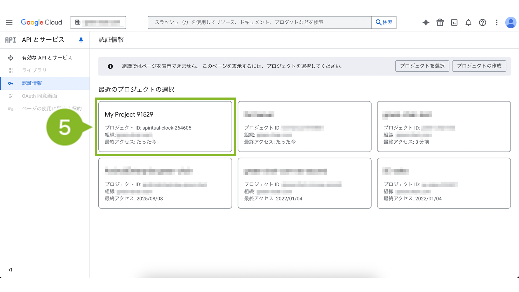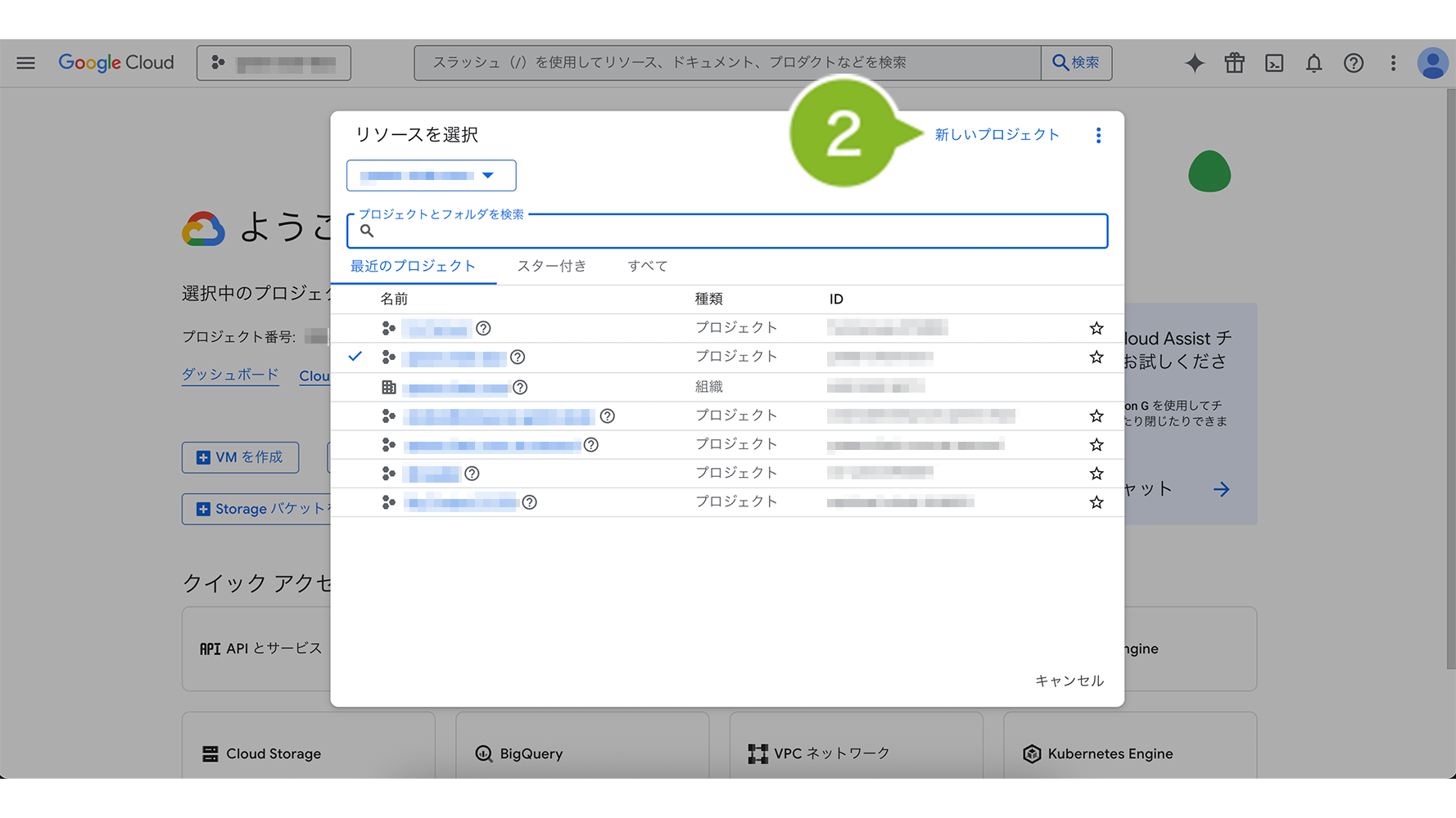 1. Google Cloud へ管理者アカウントでログインし、画面左上のポップアップからプロジェクトタブを選択します。