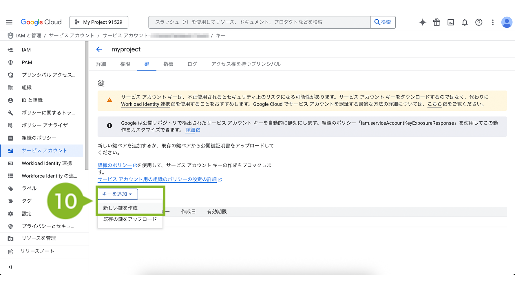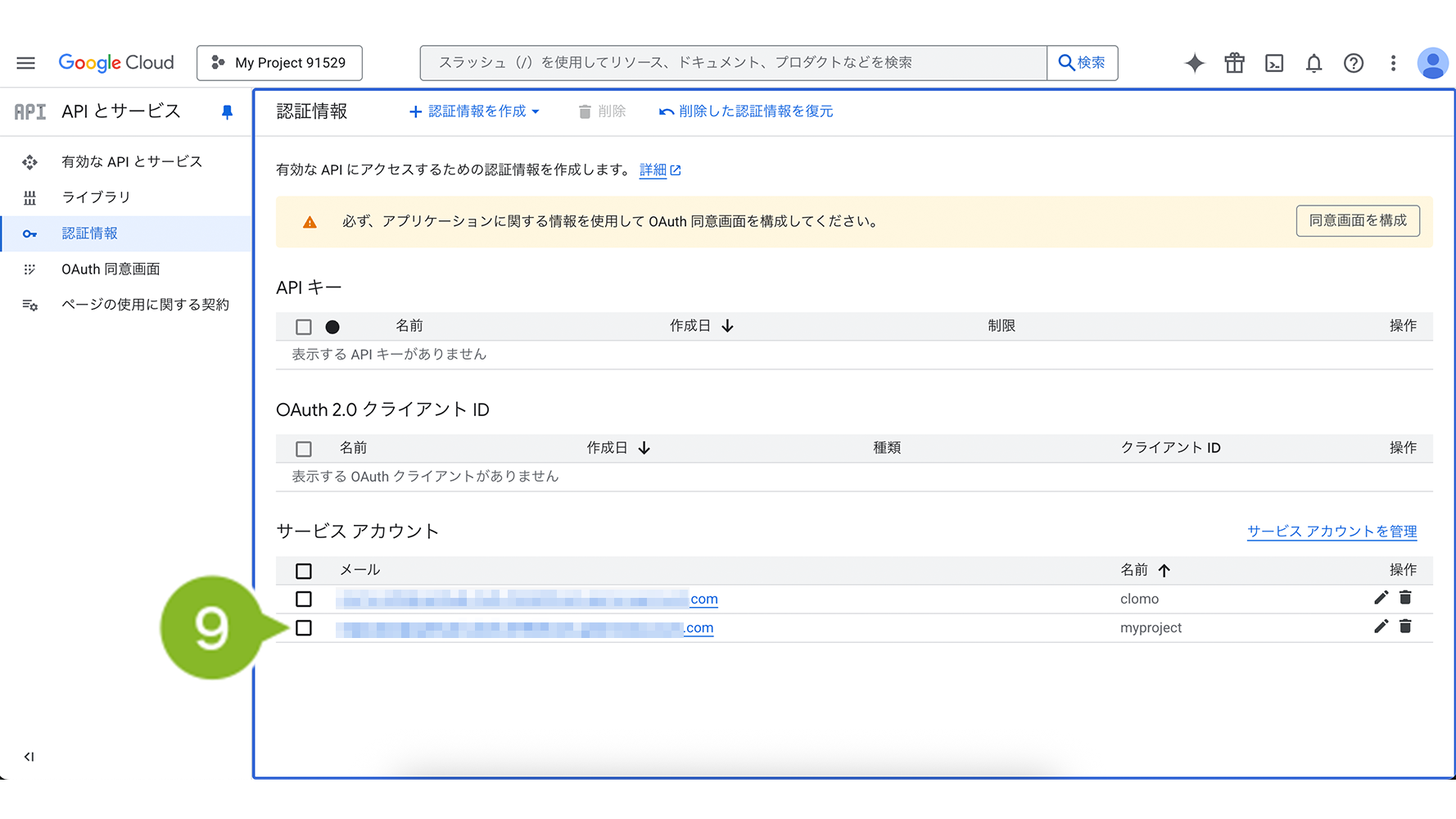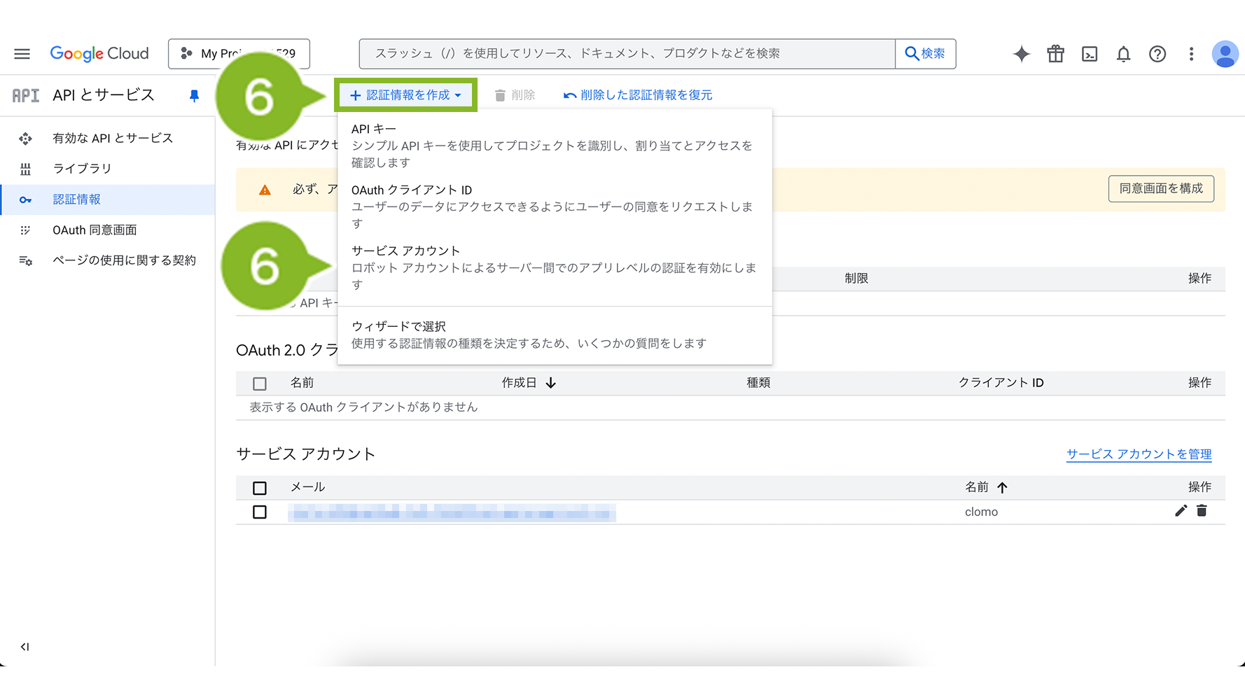 9.「サービスアカウント」から作成したプロジェクトを選択します。