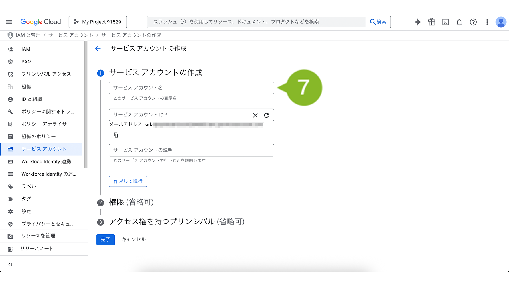 7. 「サービスアカウントの詳細」でサービスアカウント名を入力し、「作成」を選択します。