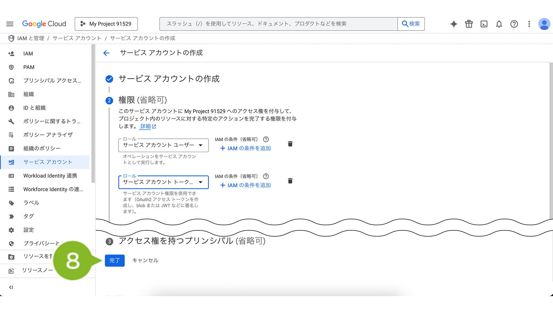 8. 「サービスアカウントの権限(オプション)」で、以下の役割を選択し、「完了」を選択します。