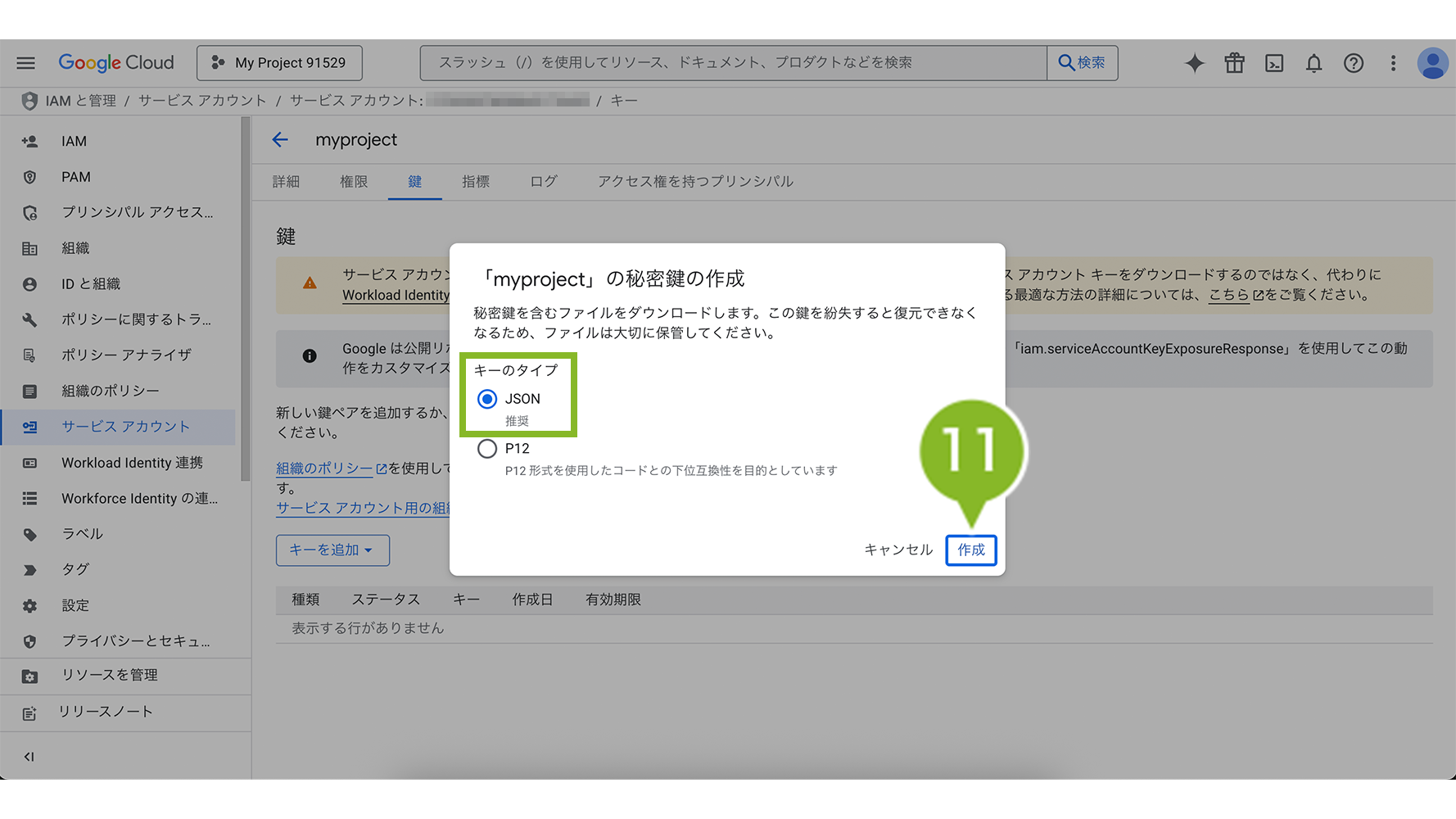 11. キーのタイプに「JSON」を選び、「作成」を選択します。