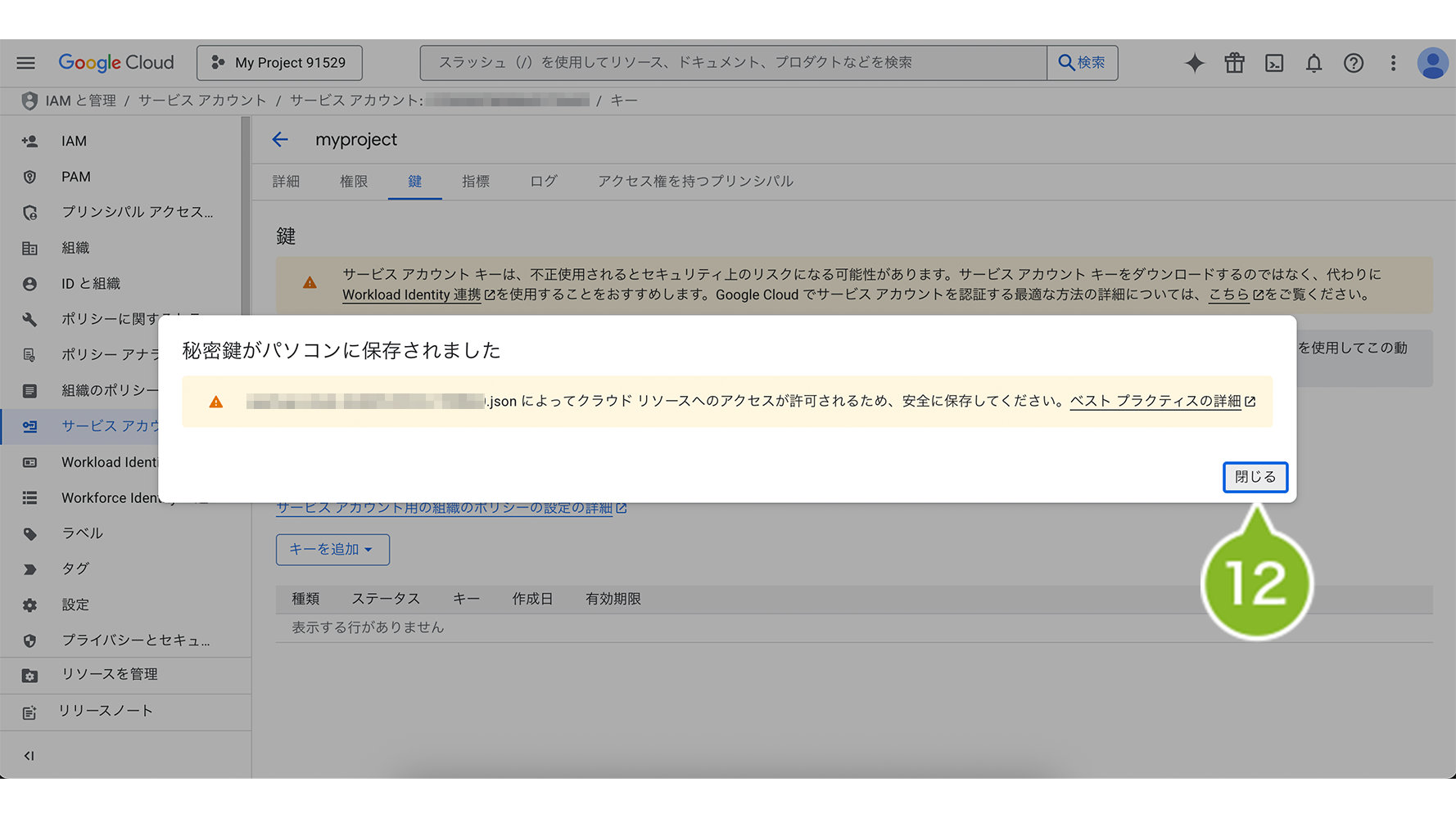 12. JSON 形式のサービスアカウントキーファイルが保存されたことを確認し、「閉じる」を選択します。
