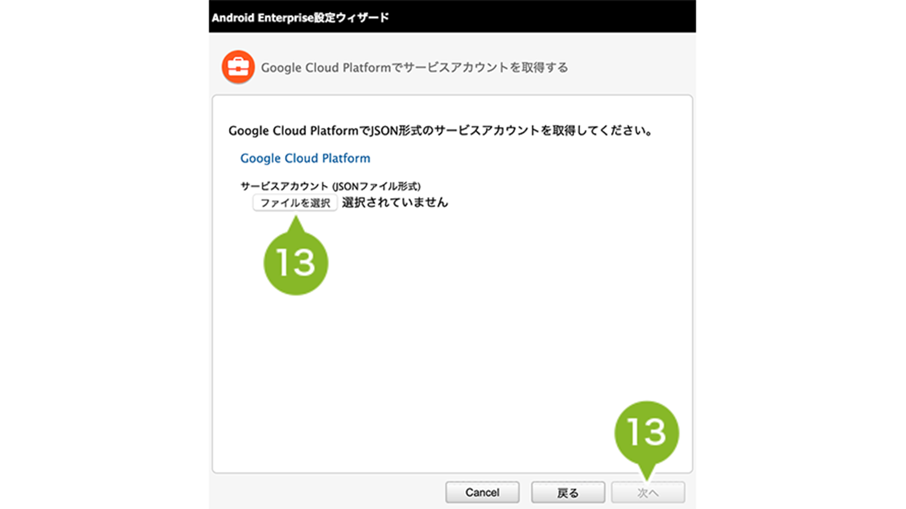 13. Android Enterprise 設定ウィザードに戻り、保存した JSON 形式のファイルを添付し、「次へ」を選択します。