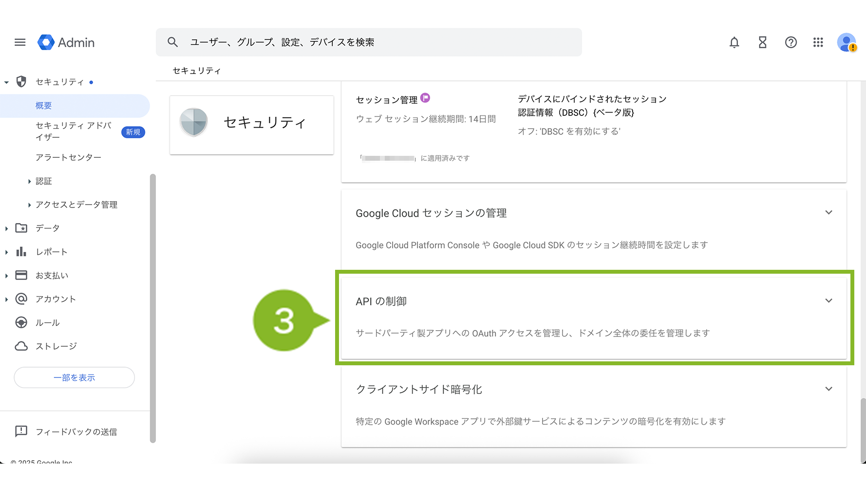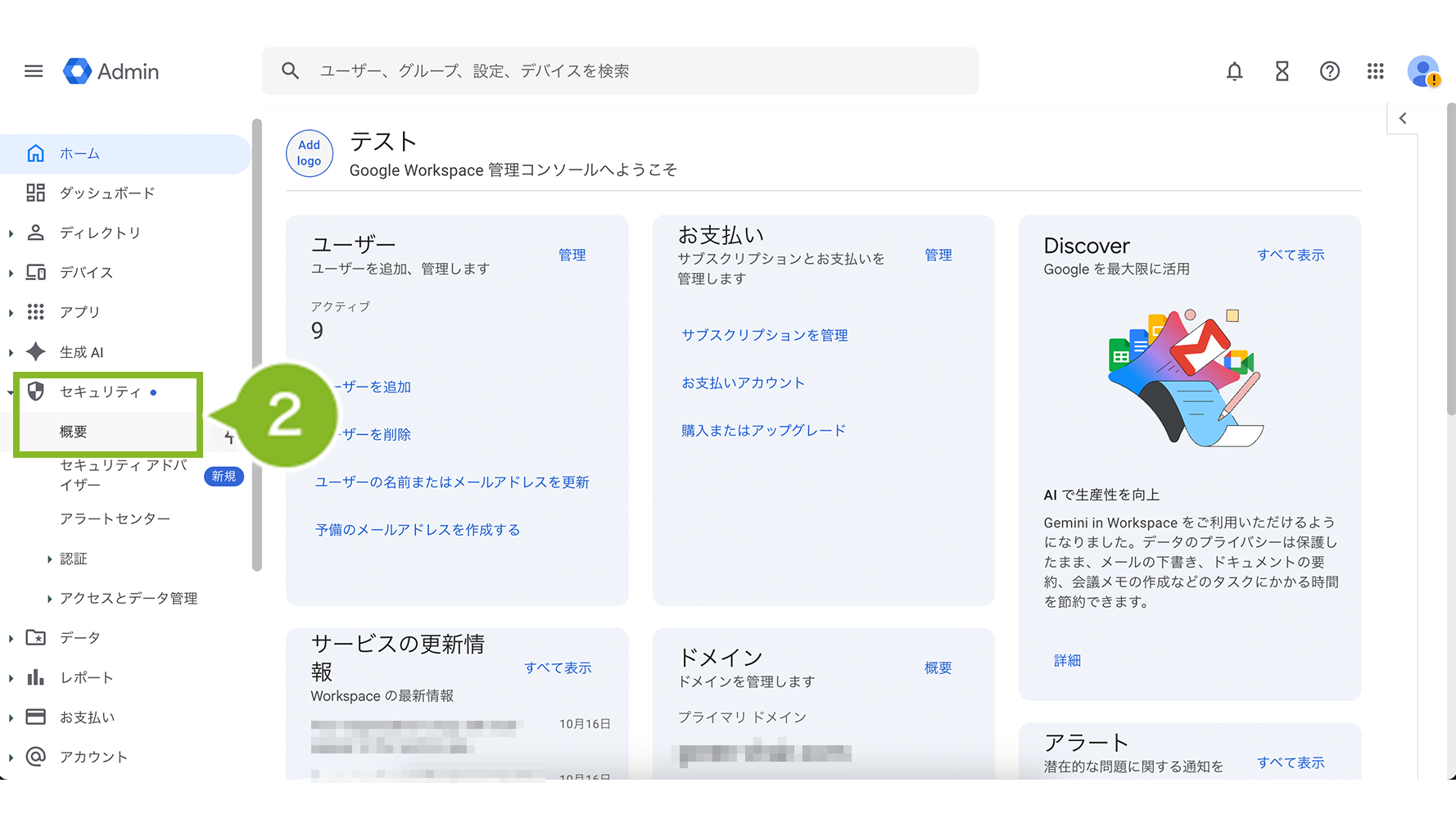 2. Google Admin コンソール へ管理者アカウントでログインし、「セキュリティ」>「概要」を選択します。
