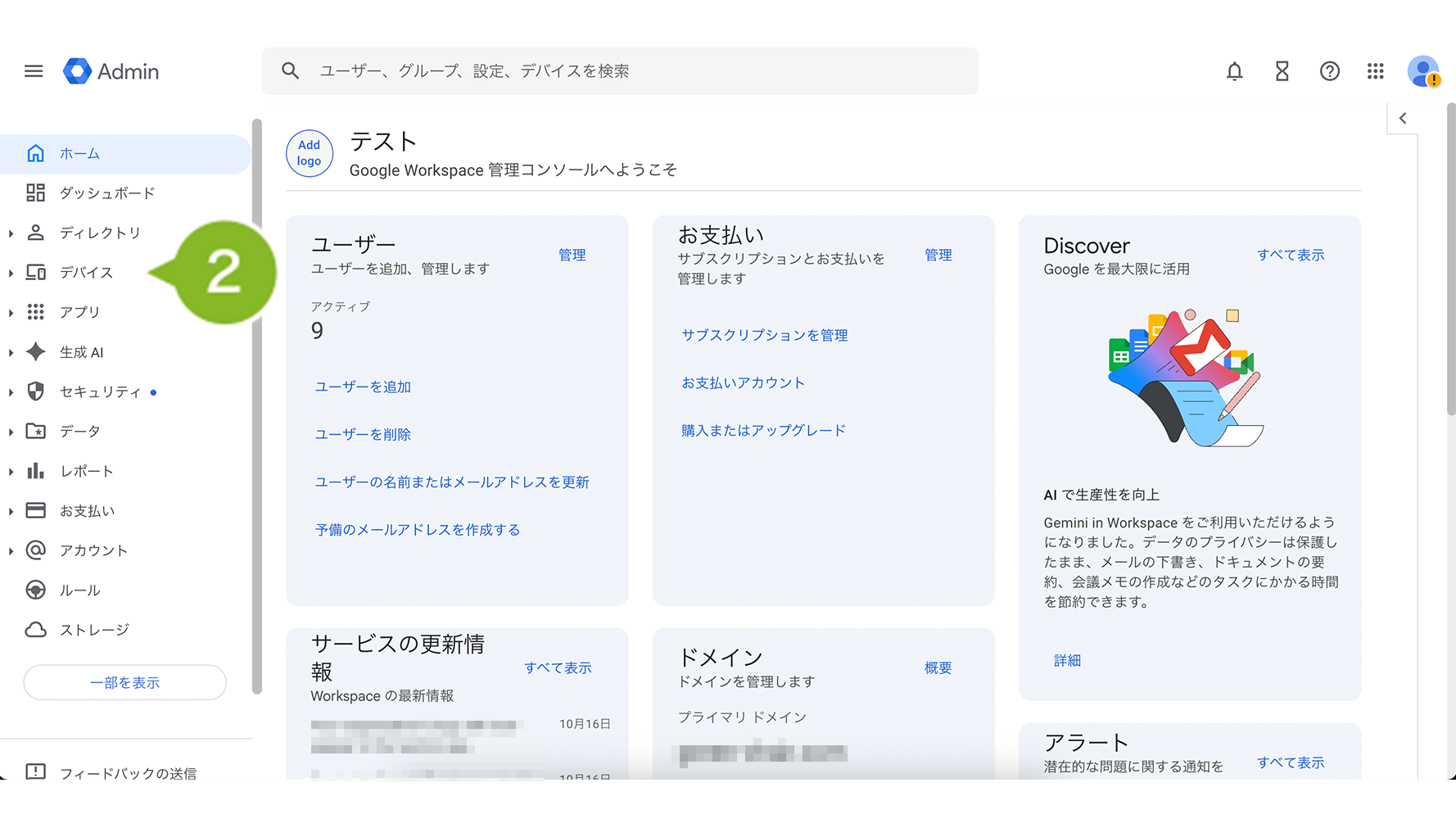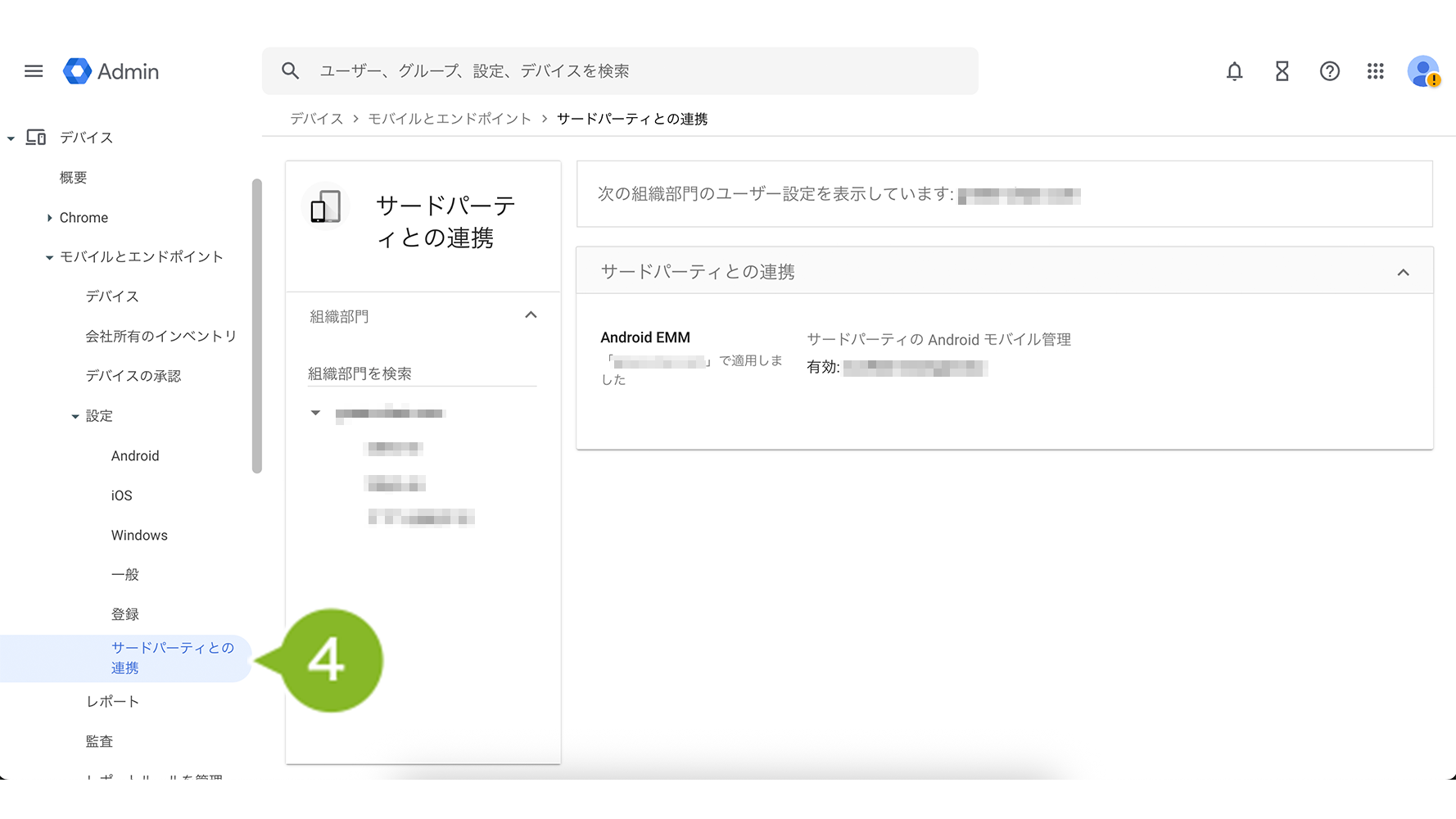 2. EMM トークンを再度確認する場合は、Google 管理コンソールにログインした状態で「デバイス」を選択します。