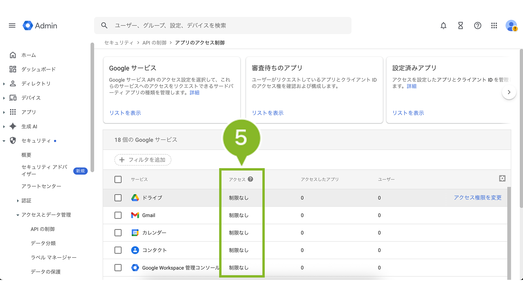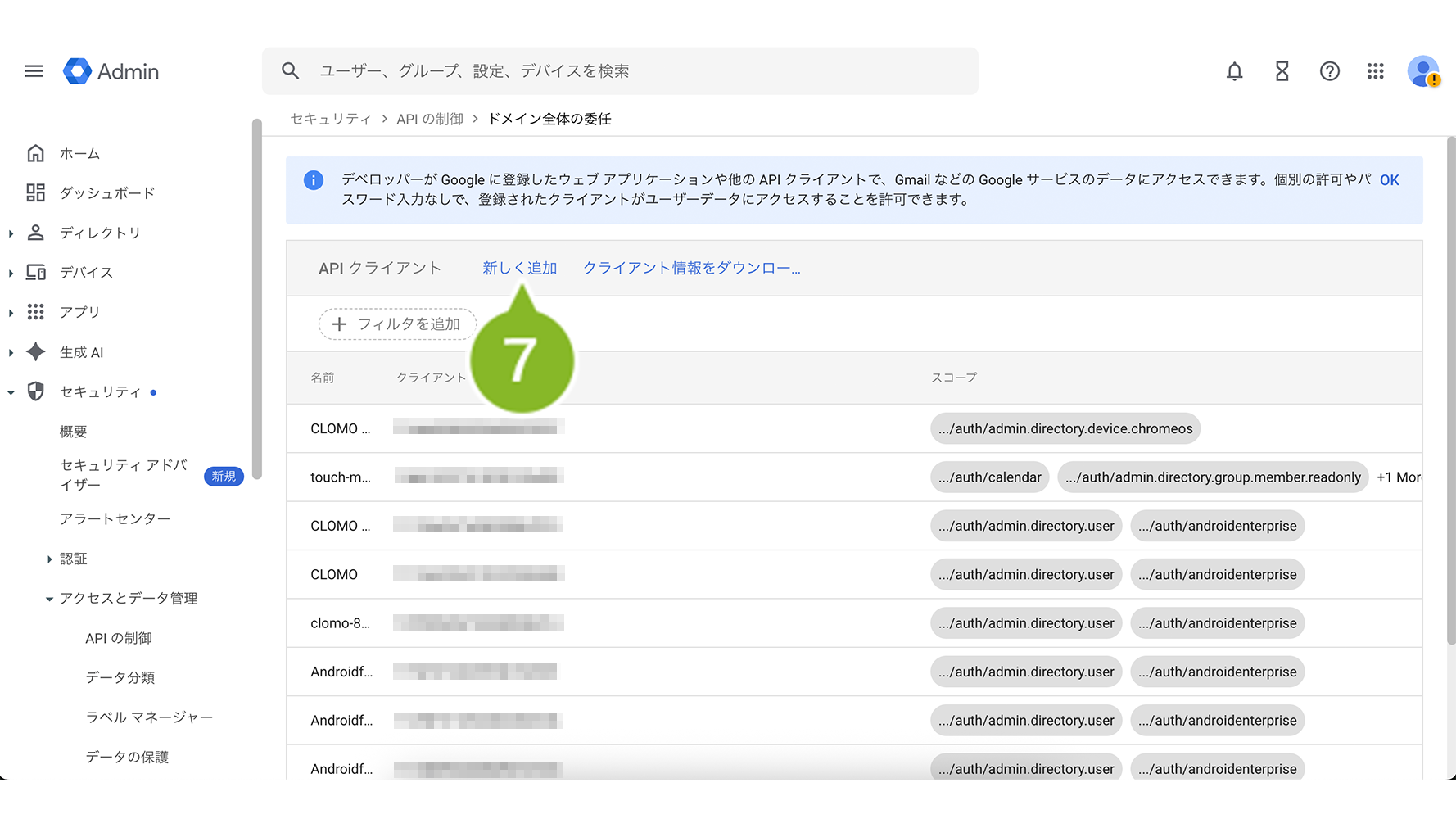 - Google Admin コンソールで API クライアントアクセスを有効にする