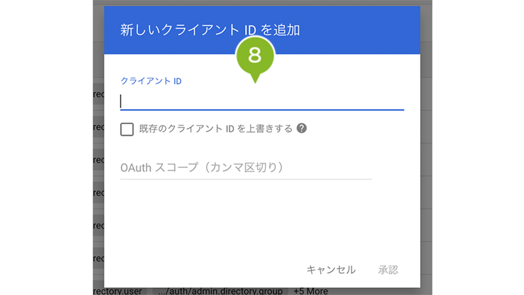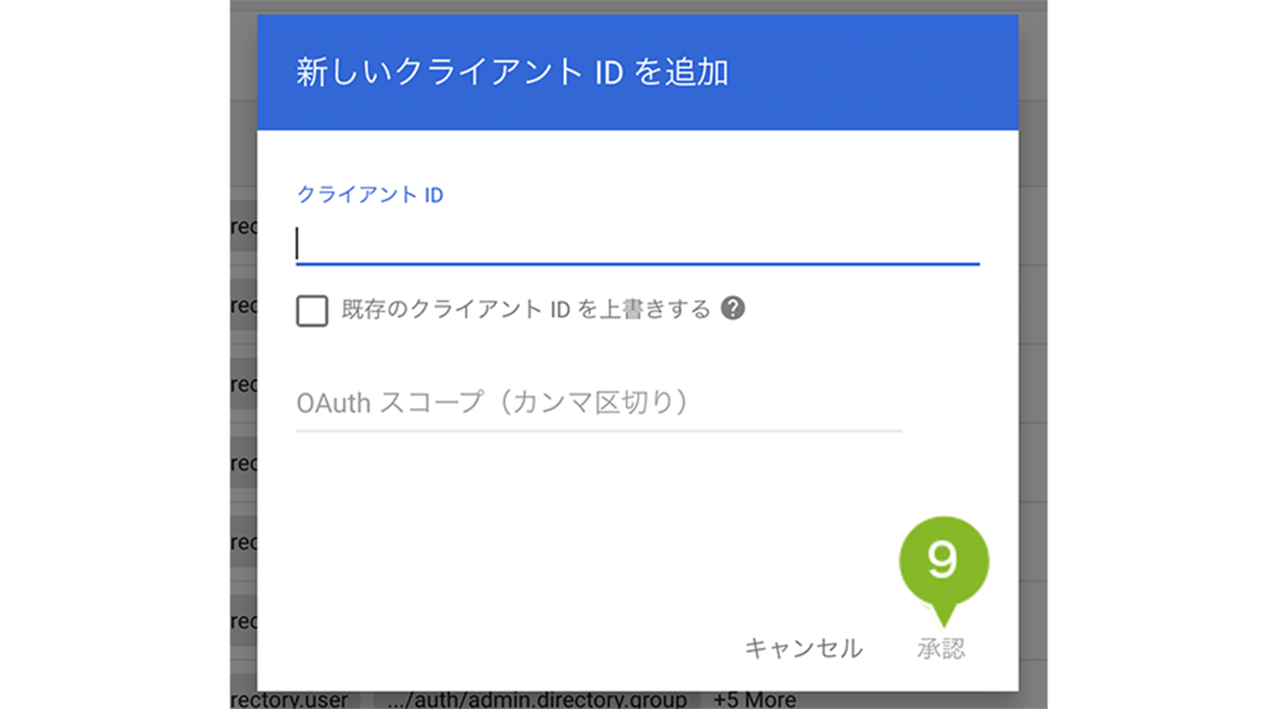 8. 手順1でクリップボードに保存した「クライアント名」と1つ以上の API スコープに貼り付けます。